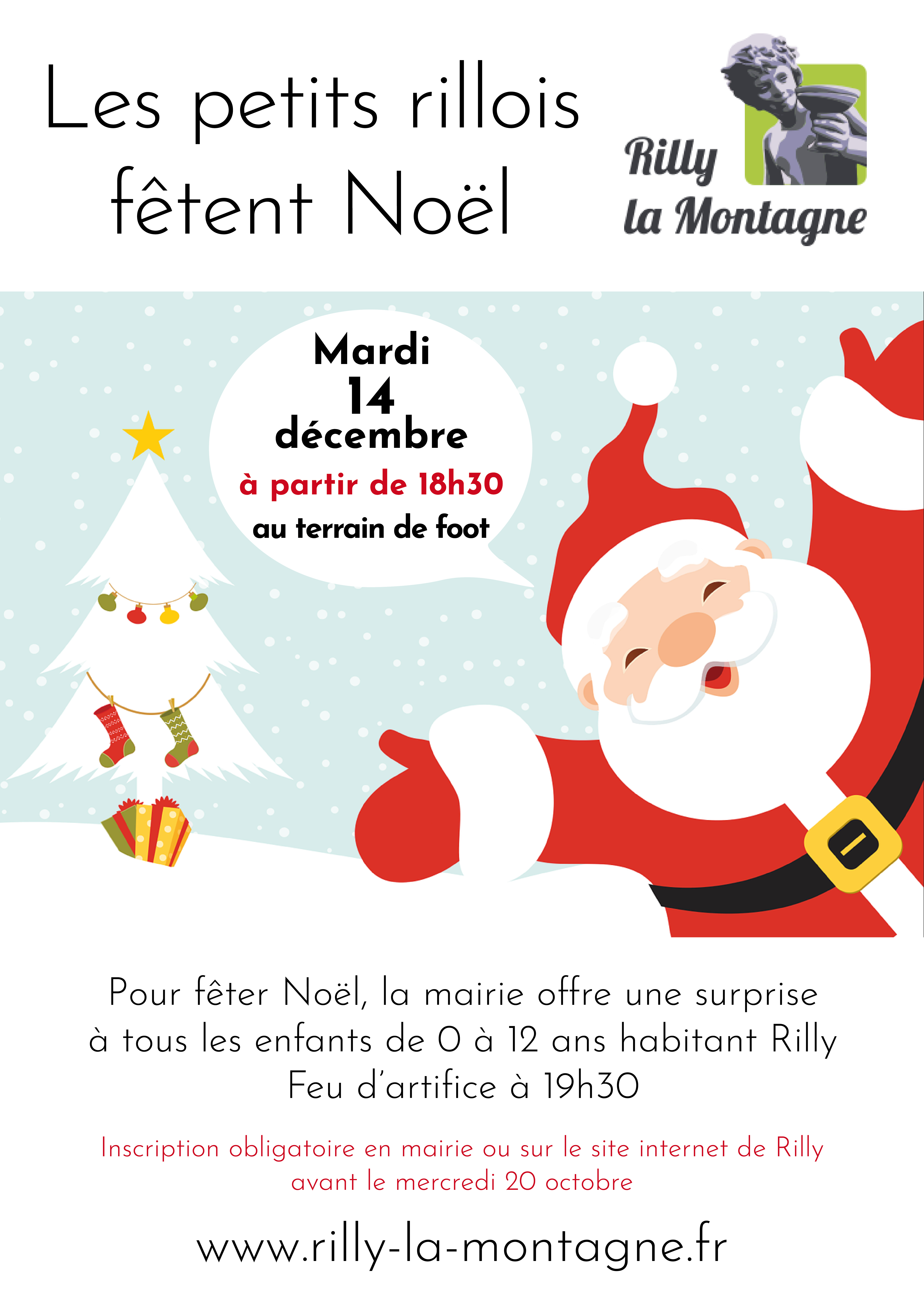 La commission Associations, Fêtes et Loisirs ainsi que le conseil municipal convient l'ensemble des enfants de 0 à 12 ans résidant à Rilly à s'inscrire à la fête de Noël. L'inscription est obligatoire en Mairie, jusqu'au 20 octobre inclus, en envoyant le bulletin que vous avez dû recevoir dans vos boîtes aux lettres ou en renseignant le formulaire en ligne. Lors de cette fête, une surprise attend les enfants